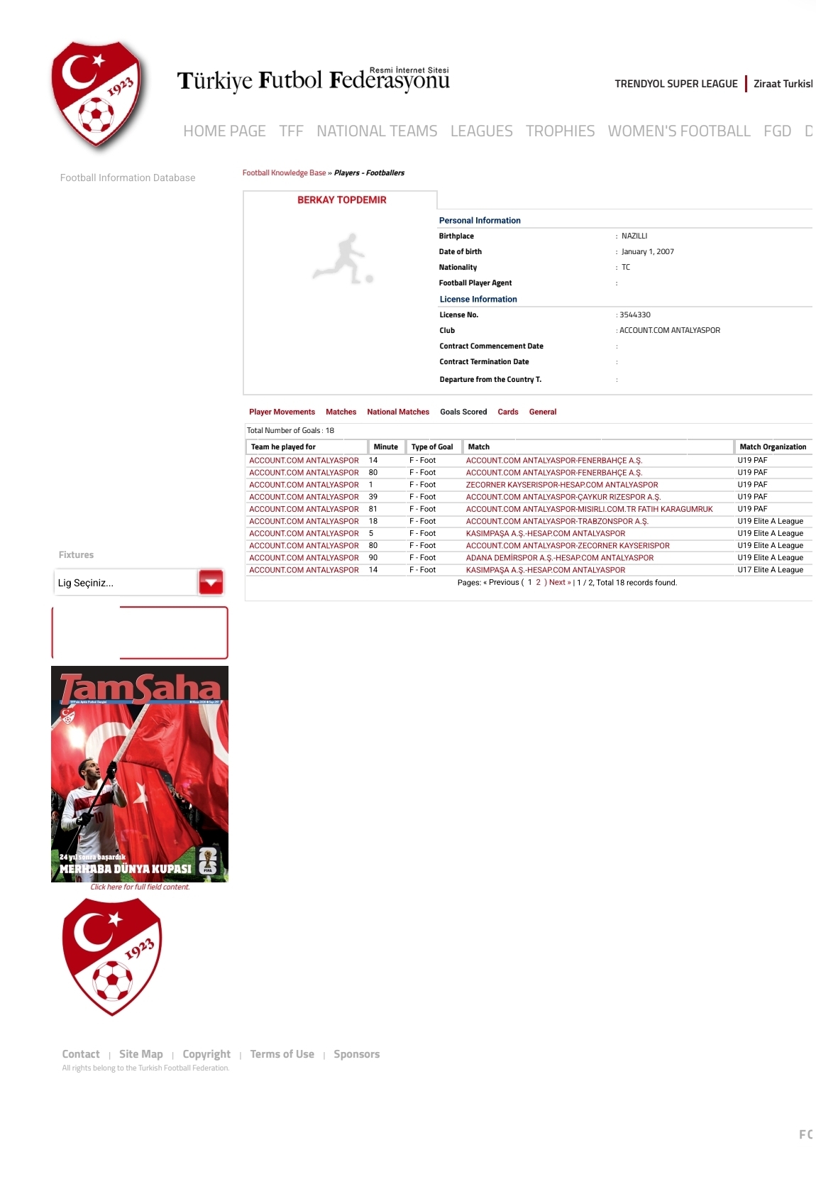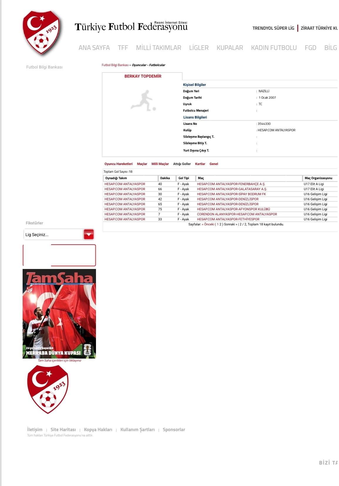 | 18 | 33' | Antalyaspor – Fethiyespor | U16 Gelişim Ligi |